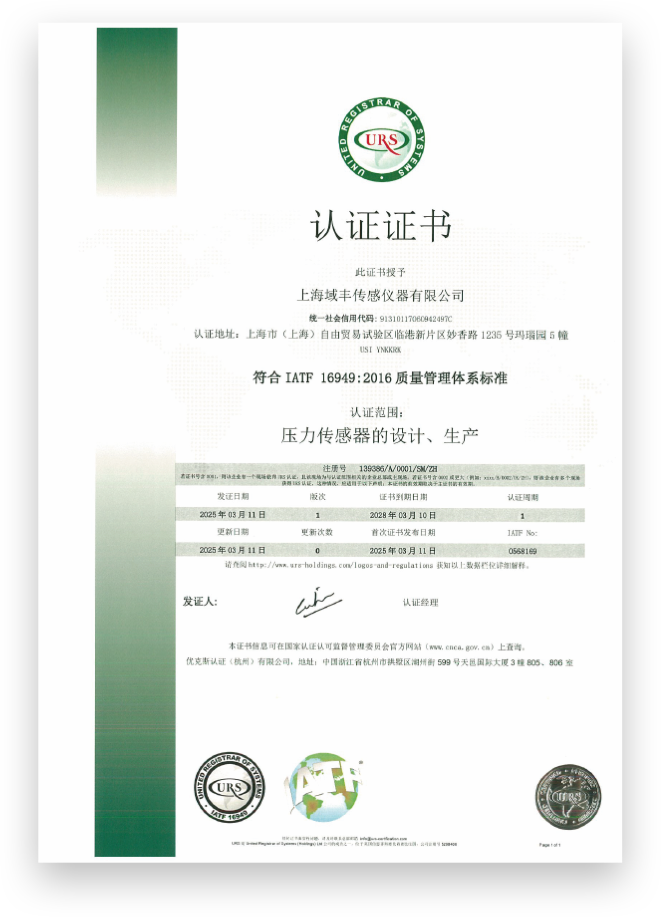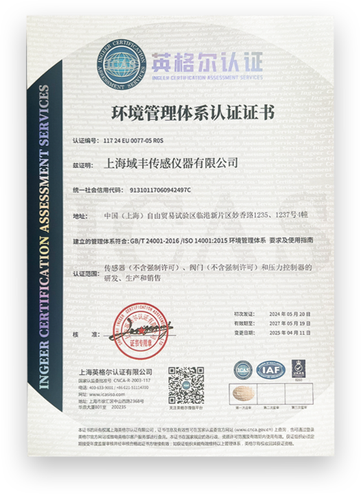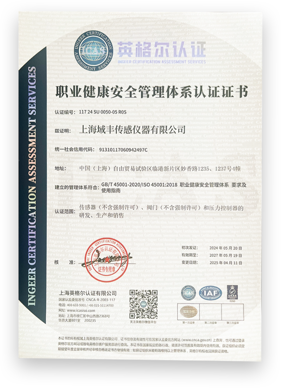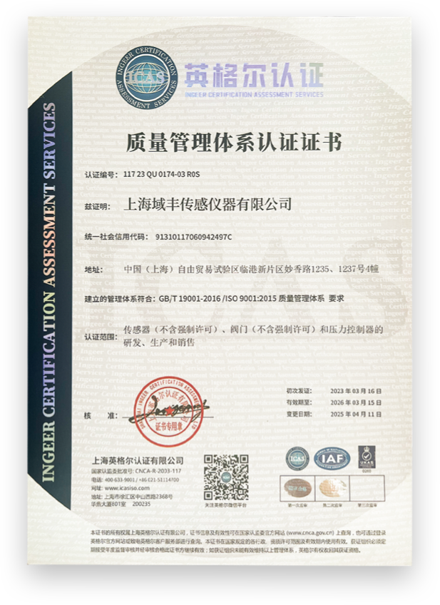上海域丰传感仪器有限公司是一家集传感器、仪器仪表、流体测量、控制系统的研发、生产、销售、服务为一体的高新技术企业。公司拥有专业的技术研发团队和完备的自动化生产线,产品远销欧美、澳大利亚、非洲、东南亚等109个国家。产品通过了ISO9001:2015质量管理体系认证,并获得多项产品专利。先进的生产设备、成熟的技术工艺、完善的质量体系,使得我们的产品始终保持在行业领先水平。